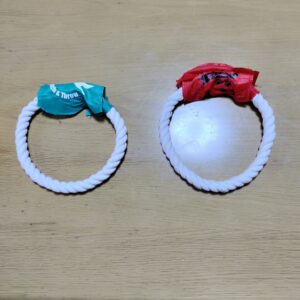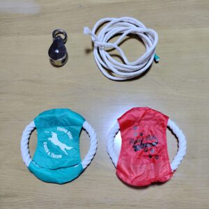 プーリーとひもは、ホームセンターで合わせて1000円位で、犬のおもちゃはダイソーで購入しました。